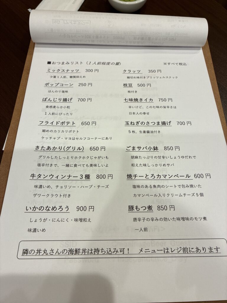 でも今回はビールのみです。何人かで行ったときは頼んでみたいところ。あと、隣の海鮮丼屋からの持ち込みが可能になっています。