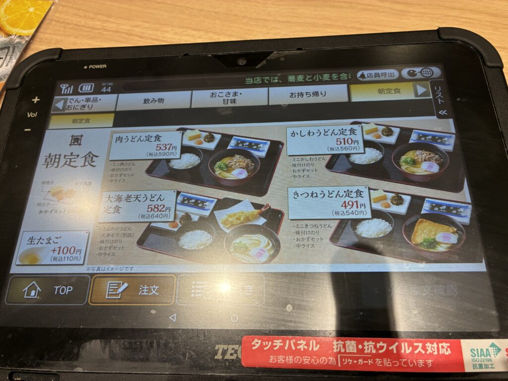 ミニうどんに、海老天。いかにも朝食といった卵焼き、高菜、明太子、海苔。朝にはうれしいセットだね。わたしはこれ。肉うどん定食(税込み590円)。
