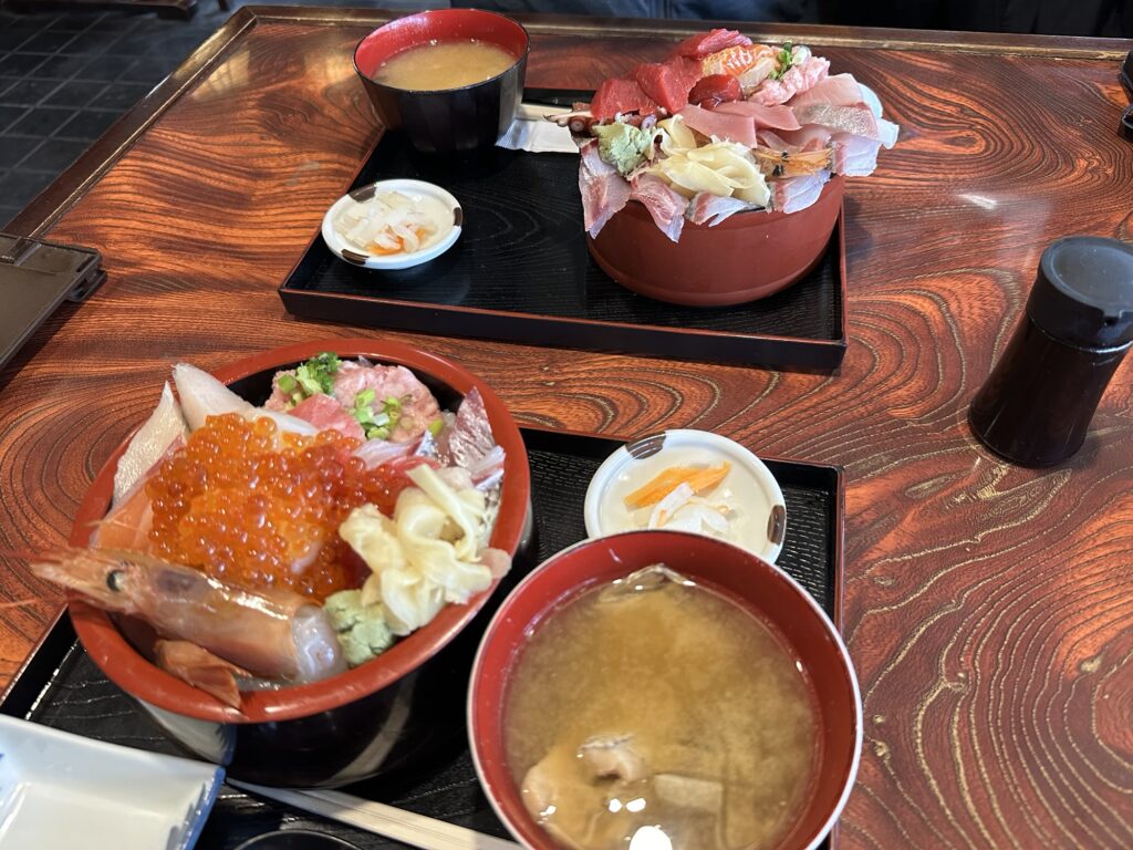 奥がネタ大盛海鮮丼(2550円)、手前が海鮮丼(上)(2750円)だよ。